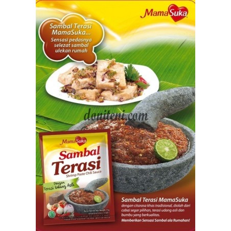 Sambal Terasi MamaSuka merupakan sambal dengan citarasa khas tradisional, diolah dari cabai segar pilihan, terasi udang asli, dan bumbu yang berkualitas memberikan sensasi sambal ala rumahan. Size: 1 Renteng (10 bks @15g)