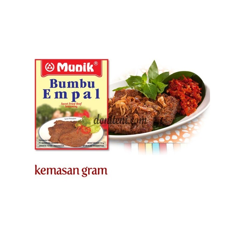 Mau bumbu empal yang meresap sampai ke setiap serat dagingnya? Ini dia Bumbu Munik Empal yang padat rasa dari bumbu tradistional Indonesia. Bukan cuma lezat manis sempurna, empal kian empuk, gurih dan bikin nagih rasanya! Ikuti petunjuk kemasan untuk menggunakan Bumbu Munik Empal yang sangat mudah. Tidak perlu ditumis atau menambah bumbu dapur lagi untuk sajian Empal Empuk yang paling sempurna dan anti gagal. Cocok untuk kalian yang sibuk dan tidak punya banyak waktu persiapan memasak, Bumbu Munik Empal juga higienis, halal, dan terjangkau. Berat bersih 110 gram. Berat kotor 130 gram
