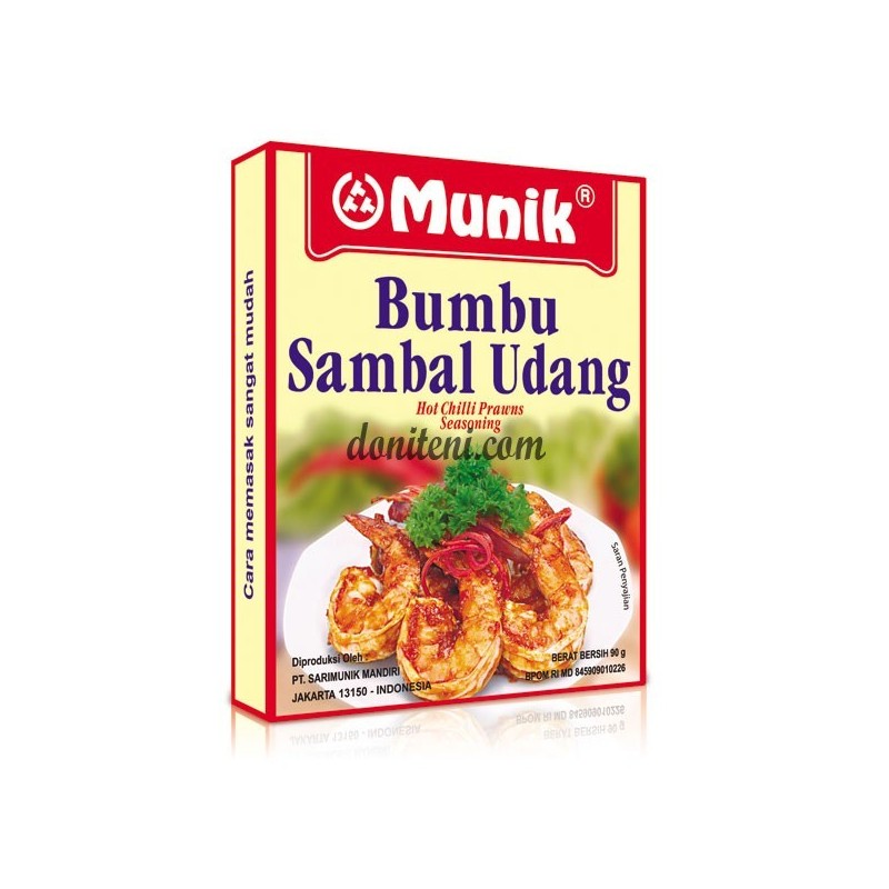 Merah segar, harum nikmat, dan pedas mantap! Ini dia bumbu sambal udang dari Sari Munik. Terbuat dari bahan rempah pilihan yang alami, segar, higienis dan halal, Bumbu Munik Sambal Udang juga bebas ekstrak dan pewarna. Hidangin sambal udang Munik di rumah, tambah terus nasinya! Mudah dan Nikmat (MUNIK), semua bumbu masak Munik terbuat dari bahan- bahan rempah alami dan diolah secara higienis untuk pemakaian terbaik Anda. Bumbu Munik Sambal Udang juga praktis, halal dan cocok digunakan siapa saja karena telah tersedia petunjuk di kemasan untuk resep sukses keluarga.
