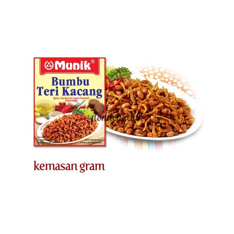 Sediakan Munik Bumbu Teri Kacang kering sebagai resep andalan cemilan favorit keluarga. Dengan paduan rasa manis, asin dan pedas yang maknyus, masakan kian praktis dan selalu tersedia untuk melengkapi suasana ngumpul di rumah. Munik Bumbu Teri Kacang kering adalah bumbu masak indonesia yang (MU-dah dan NIK-mat). Semua bumbu masak Munik terbuat dari bahan-bahan rempah alami, segar, higienis dan halal untuk digunakan. Tinggal dicampurkan tanpa harus dimasak ataupun diberikan bumbu atau perasa lainnya. Tanpa menggunakan ekstrak dan pewarna, Munik Bumbu Teri Kacang yang terjangkau dan praktis wajib sedia di dapur ibu pintar.