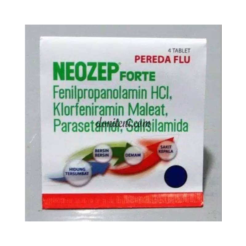 Neozep Forte tablet adalah obat yang digunakan untuk mengobati gejala flu seperti demam, sakit kepala, hidung tersumbat, dan bersin-bersin. Neozep Forte tablet mengandung paracetamol, obat yang memiliki aktivitas sebagai antipyretic sekaligus analgetic, phenylpropanolamine, obat nasal decongestan yang merupakan stereoisomer dari norephedrine, salcylamide, obat penghilang rasa sakit dan penurun demam dan chlorpheniramine maleate, obat alergi golongan antihistamin generasi pertama.