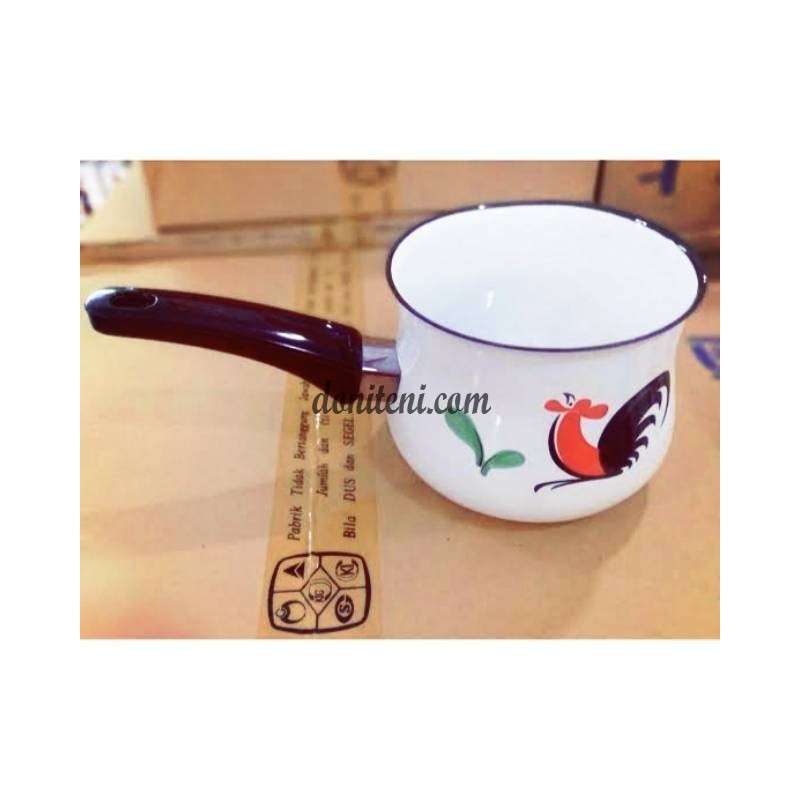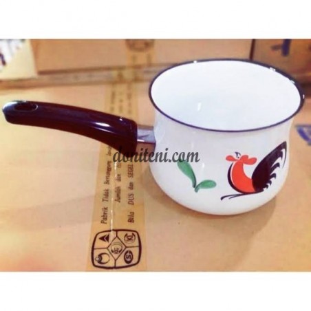 Panci Susu / Milk Pan Panci susu Kukuruyuk, berbahan dasar enamel bermotif ayam jago. Bentuknya yang minimalis, berfungsi untuk mengahangatkan susu maupun minuman favorit Anda. Dilengkapi dengan gagang yang kokoh sangat mudah digunakan. Panci milk pan kukuruyuk ini aman digunakan di atas kompor, microwave dan dishwasher (mesin pencuci piring). Detail Ukuran: Tinggi: 9 cm Diameter: 12 cm Diameter gagang panci: 21 cm, Volume: 1100 ml.