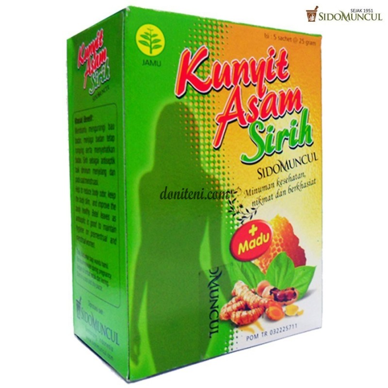 Indikasi / Kegunaan Untuk membantu mengurangi bau badan, menjaga badan tetap ramping, dan menyehatkan badan. Sirih merupakan antiseptik baik diminum menjelang dan pada saat datang bulan Kandungan / Komposisi Tiap sachet mengandung kunyit, asam, sirih, madu, gula, garam Dosis Diminum 1-2 kali sehari 1 sachet Cara Pemakaian Dikonsumsi menjelang dan pada saat datang bulan; Campurkan 1 sachet jamu kunyit asam sirih plus madu Sidomuncul ke dalam 150 ml air dingin aduk dan siap diminum. Kemasan 1box isi 5 sachet