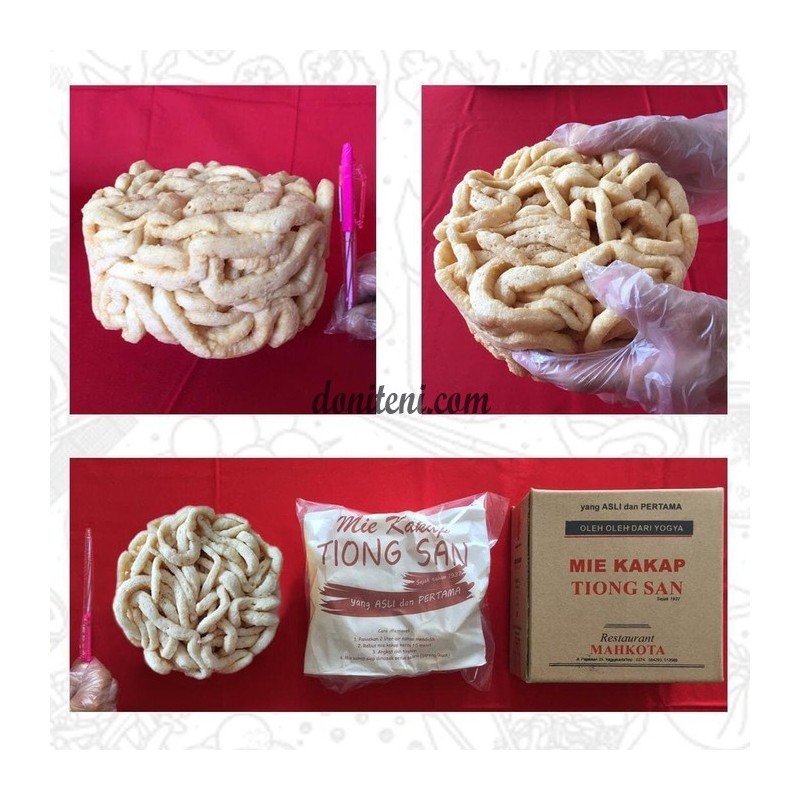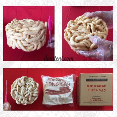 Kini telah hadir Mie Kakap Tiong San dalam bentuk kering dengan ukuran kecil, dapat dimasak menjadi 2 sampai 3 porsi masakan (mie kakap goreng/kuah) yang nikmat sesuai selera anda, selain itu juga dapat dijadikan camilan yang enak dan renyah. Mie Kakap Tiong San yang Asli dan Pertama hanya diproduksi oleh Restaurant Mahkota (d/h Tiong San) sejak tahun 1937 di Yogyakarta. Mie Kakap Tiong San bukan mie biasa, karena dibuat menggunakan bahan utama ikan kakap segar, tepung dan telur berkualitas untuk menghasilkan mie dengan cita rasa yang sangat unik. Mie Kakap Tiong San dalam bentuk kering mempunyai ciri khas tersendiri dan tidak menggunakan bahan pengawet, sehingga hanya dapat tahan selama 1 bulan dalam suhu ruangan atau 3 bulan jika disimpan dalam lemari pendingin (kulkas).
